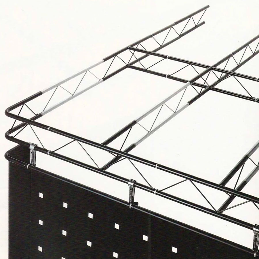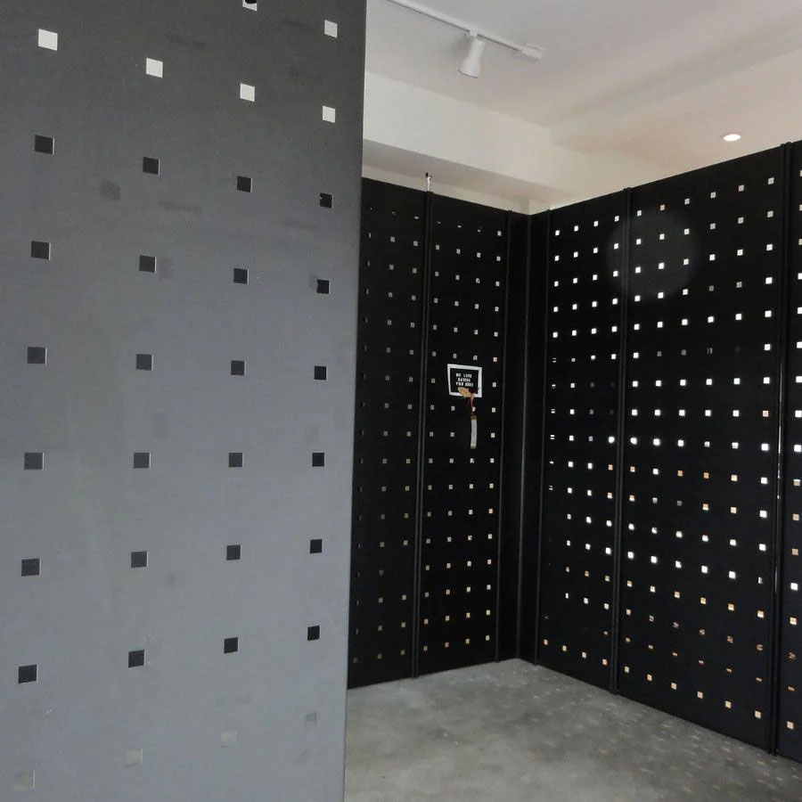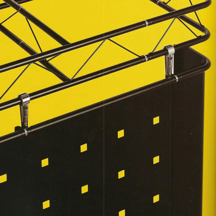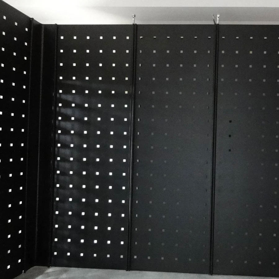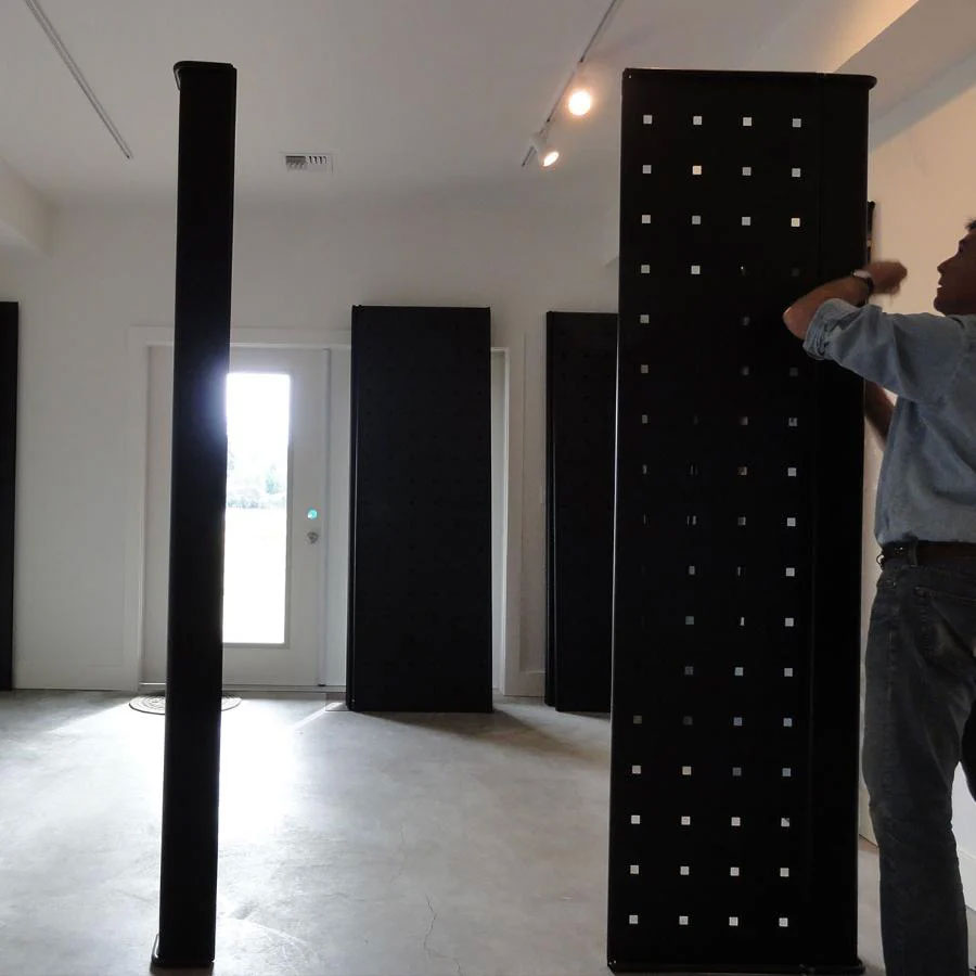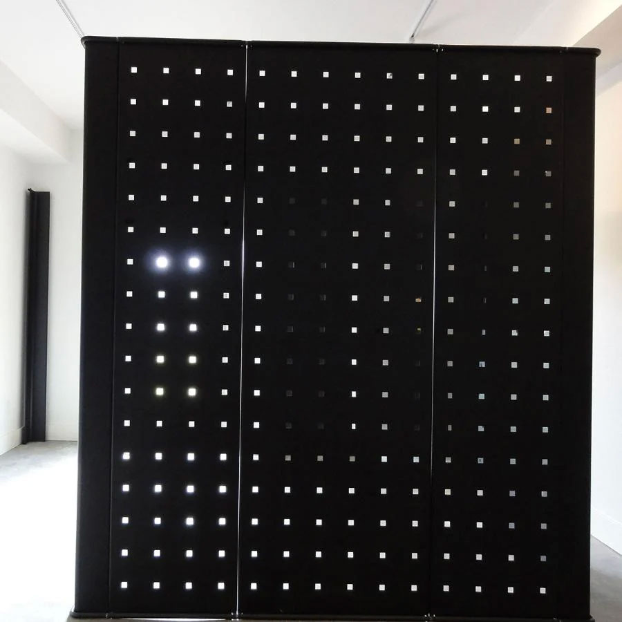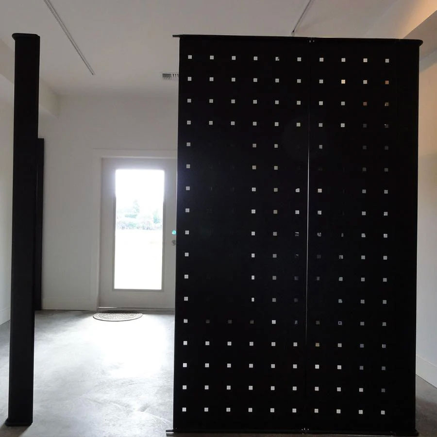 Milano Black metal panels for freestanding or wall display, tradeshow booth, meeting space, showroom display, retail visual background. Can be configured many ways. Very modern, with stamped squares in panels. Sturdy, strong and assembles easily with just an allen wrench. Vintage classic yet timeless in design.